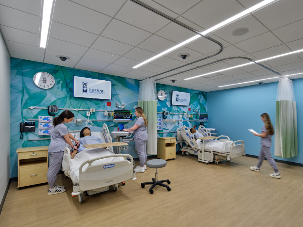 Located on the first and second floors of the Mondor Center for Nursing and Health Sciences, the Skills Labs combine classroom learning with hands-on clinical practice. Each lab features a classroom area, twelve hospital beds, and a fully stocked medical supply room, creating a hybrid environment where students learn and apply core nursing procedures.